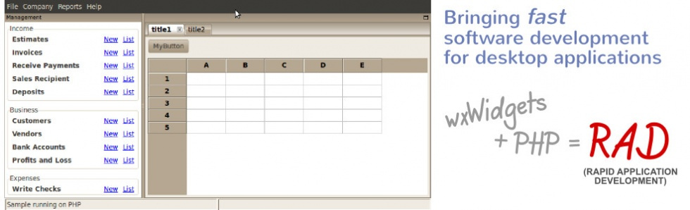 With the ease and flexibility that we have grow with while developing for the web with PHP, and the great wxWidgets framework, we are striking for simpler, easier, faster and fun experience when programming for the desktop.