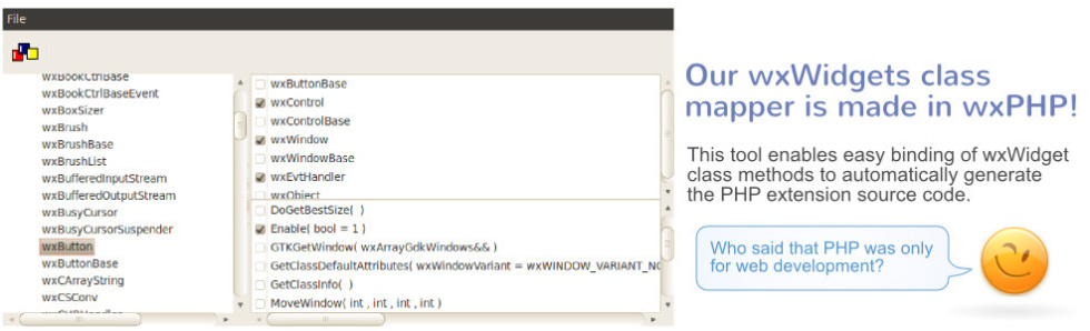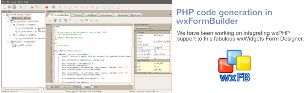 For easier development of graphical user interfaces, PHP code generation support was added to wxFormBuilder in order to facilitate the design of PHP gui windows with less coding effort. To get the wxFormBuilder latest builds that include support for PHP visit the download section.